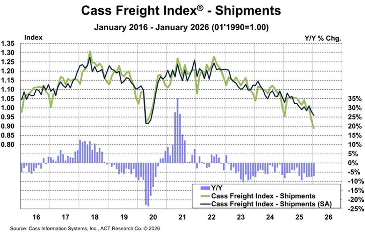 The shipments component of the Cass Freight Index fell 7.1% year over year and 4.9% month over month. The expenditures component also declined, decreasing 3.6% month over month; the year-over-year result was basically flat, inching up just 0.6% from January 2025. The Cass Truckload Index rose 1.7% month over month in January after a 1% increase in December.